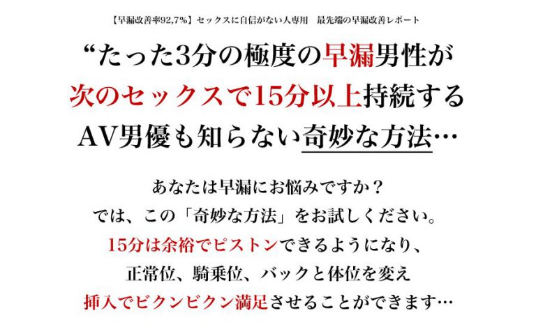 この教材は早漏対策教材であり、整体師の茂木謙二さんによる早漏克服方法になります。ただ、ペニスに刺激を感じにくい体位方法を学んだり、女性の膣内を濡らすなど、早漏を治すと言うより、早漏でも長続きする方法を解説していますので、早漏克服を図る際に、この教材だけでは、不十分と言えますね。